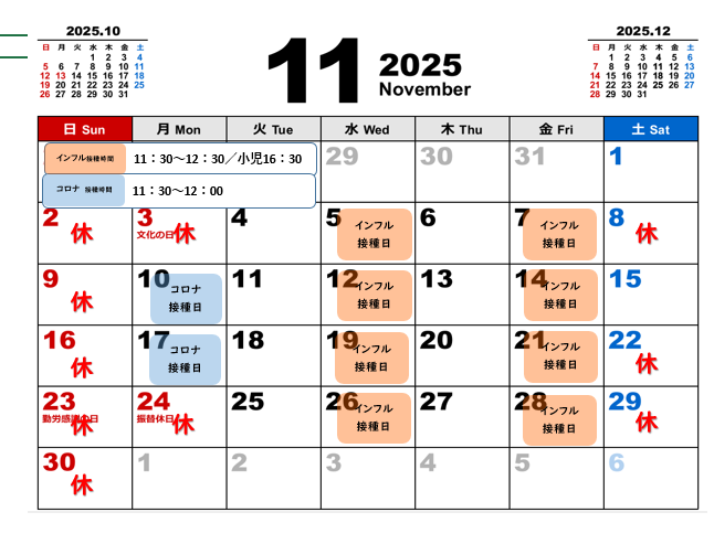 | 小児予防接種 | BCG,ヒブ,プレベナー,5種混合,B型肝炎,ロタ | 月 14:30〜 |